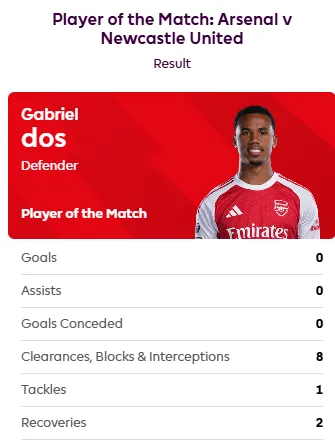 虎扑04月26日讯 英超第34轮,阿森纳主场1-0击败纽卡斯尔联,加布里埃尔在防守端表现稳健。